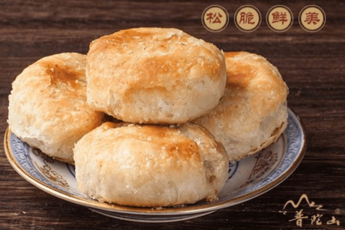 觀音餅是在原來(lái)普陀山素餅制作工藝基礎(chǔ)上,以海苔,黑芝麻、花生、豆沙等為主要原料精制而成。成品色澤金黃,外酥里糯。