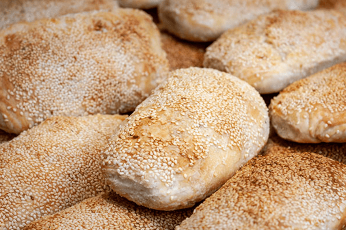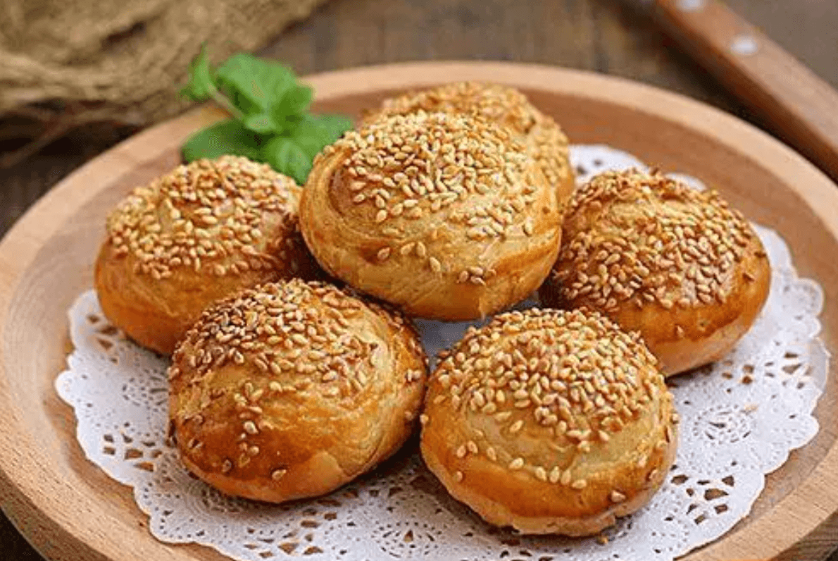 蟹殼黃因其形圓色黃似蟹殼而得名。蟹殼黃是用油酥加酵面作坯,先制成扁圓形小餅,外沾一層芝麻,貼在烘爐壁上烘烤而成,咸甜適口,皮酥香脆。